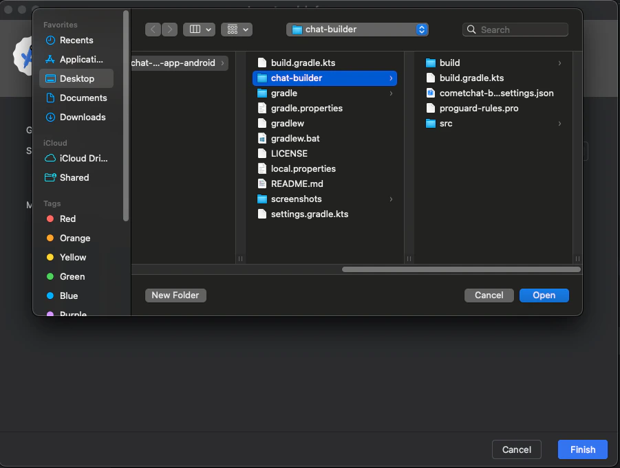 Copy thecometchat-builder-settings.json file from your exported code into your app module’s root directory (same level as build.gradle.kts).