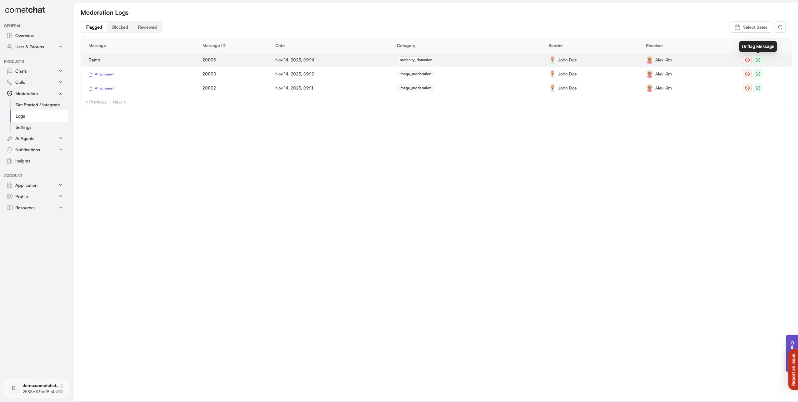 Login to CometChat Dashboard → Select your app → Moderation → Flagged Messages