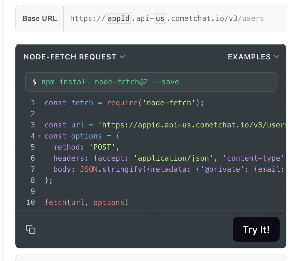 To further assist you in integrating CometChat’s REST API into your application, we provide sample code snippets in popular programming languages such as JavaScript, Python, NodeJS, and PHP. These snippets demonstrate how to make API requests and handle responses, helping you kickstart your development process.