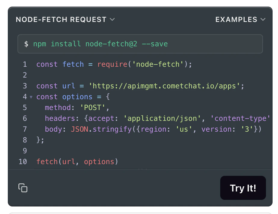 To further assist you in integrating CometChat’s REST API into your application, we provide sample code snippets in popular programming languages such as JavaScript, Python, NodeJS, and PHP. These snippets demonstrate how to make API requests and handle responses, helping you kickstart your development process.