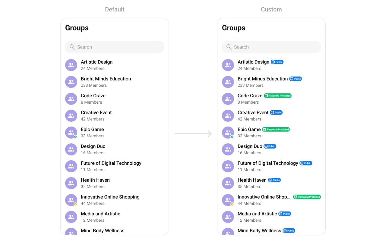 | Subtitle view | setSubtitleView(GroupsViewHolderListener) | Subtitle text below name |