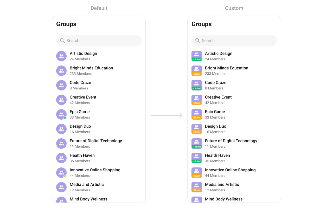 | Leading view | setLeadingView(GroupsViewHolderListener) | Avatar / left section |