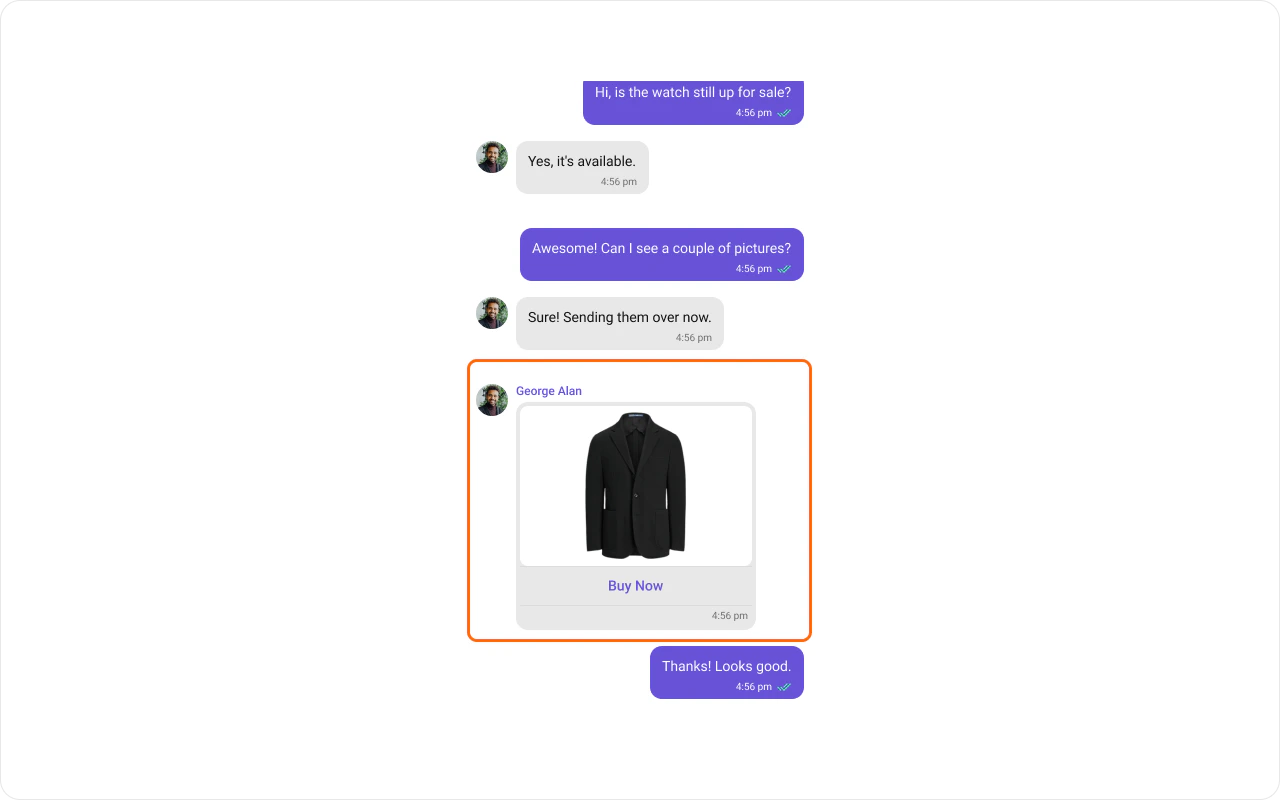 "card"appear in theMessageListas a purple contact card showing the contact’s avatar, name, timestamp, delivery receipt (for sent messages), and two action buttons (“Add Contact” and “Message”).