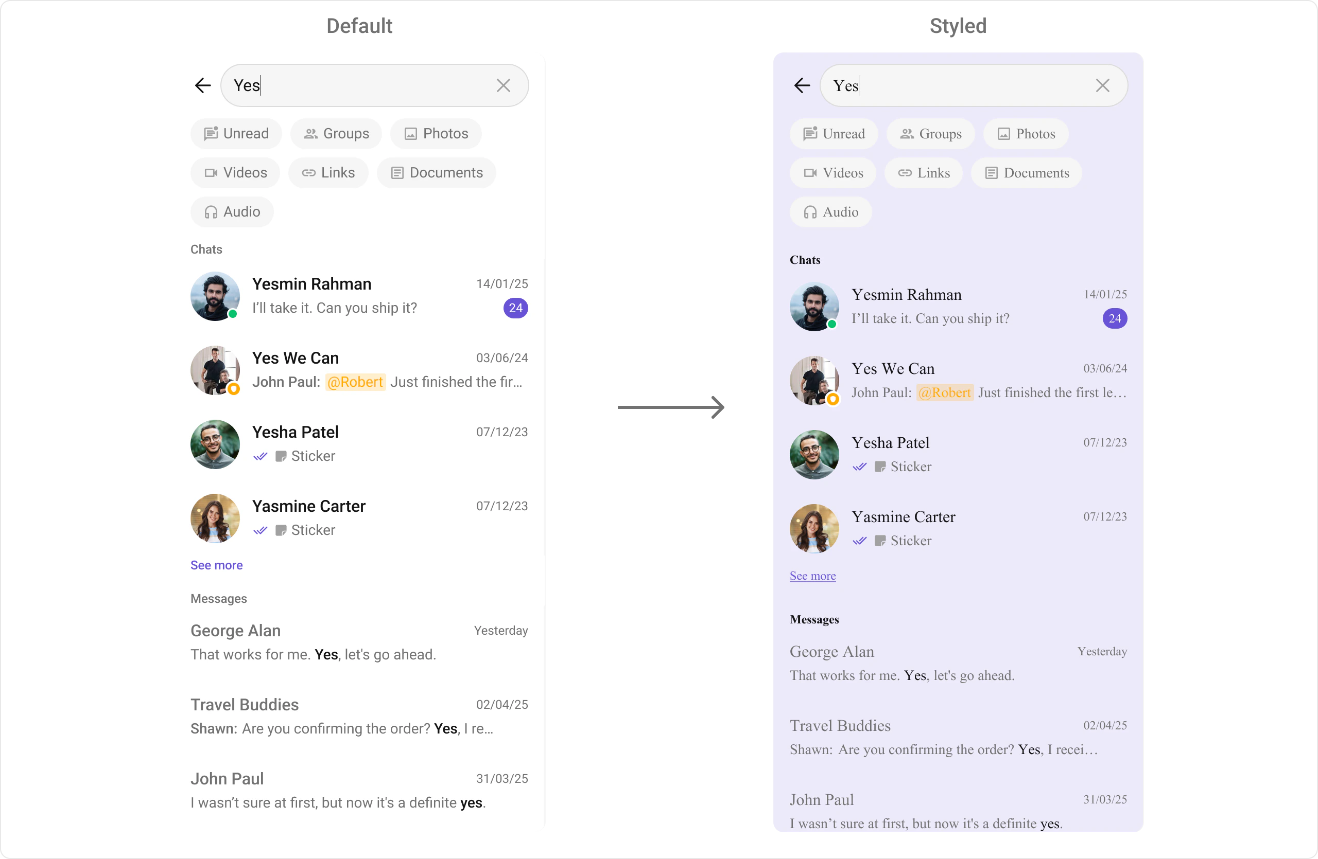 | Change colors, fonts, spacing | themes.xml | CometChatSearchStyle | <item name="cometchatSearchBackgroundColor">#EDEAFA</item> |
