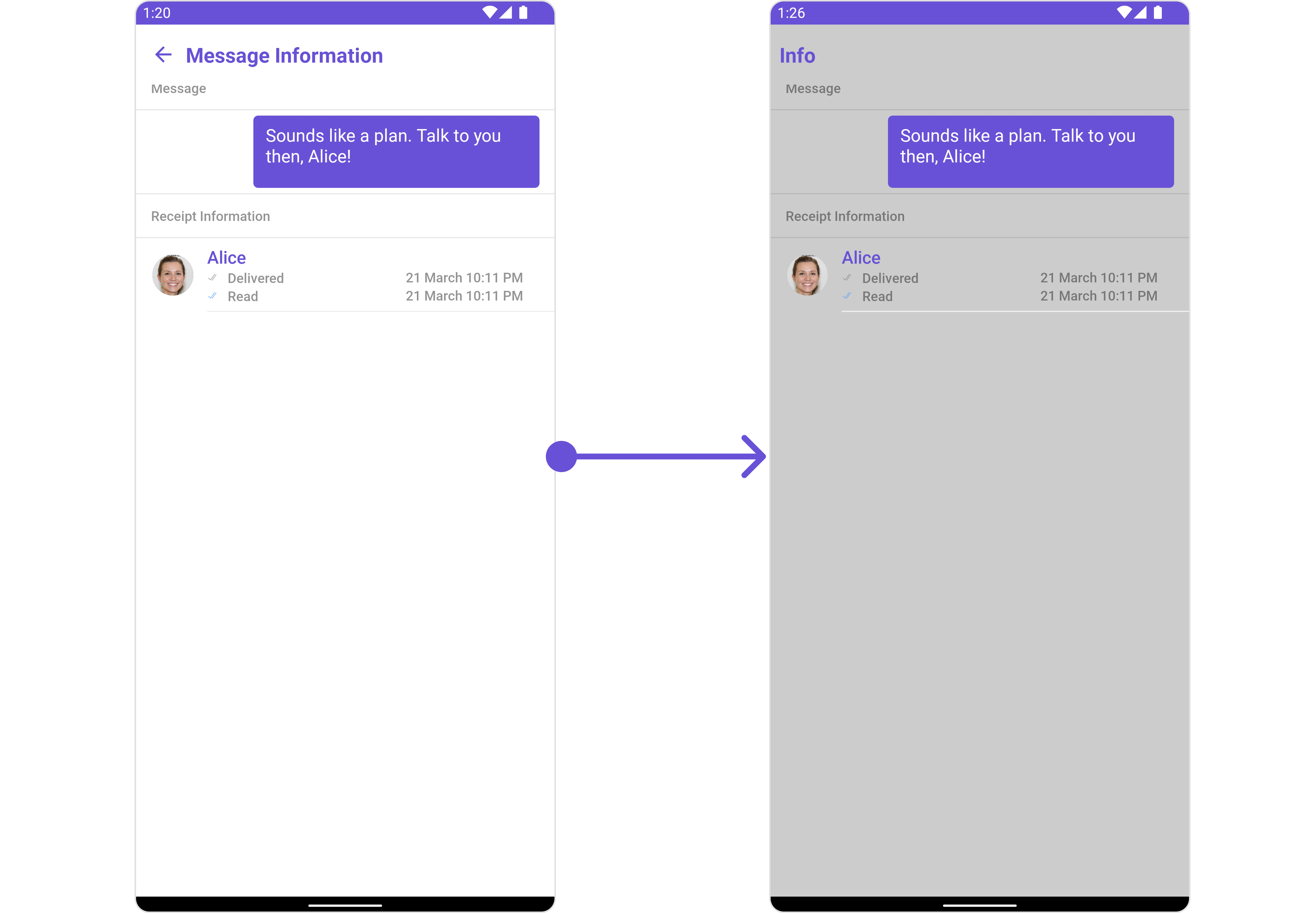 In the above code, the back button is disabled, the title is set to “Info”, and the background color is set to light gray. Finally, this configuration is applied to the message list.