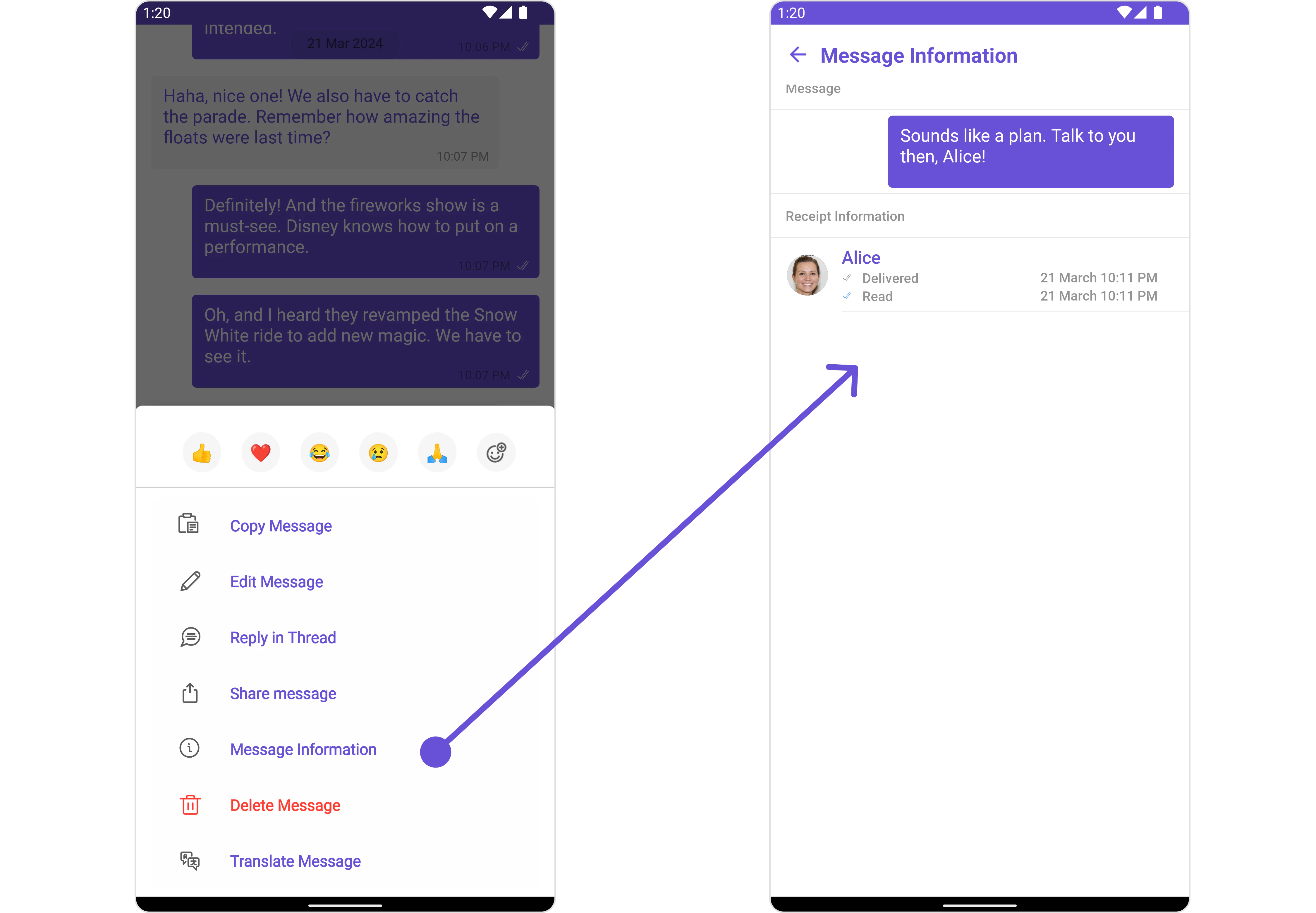 onThreadRepliesClick is triggered when you click on the threaded message bubble. The onThreadRepliesClick action doesn’t have a predefined behavior. You can override this action using the following code snippet.