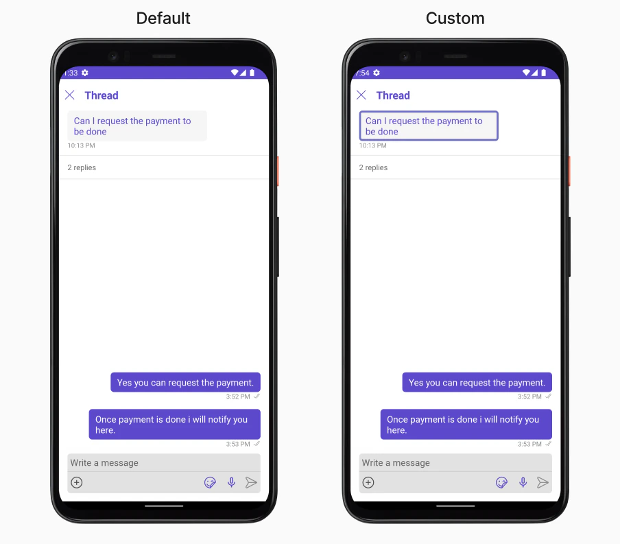 For advanced-level customization, you can set custom views to the component. This lets you tailor each aspect of the component to fit your exact needs and application aesthetics. You can create and define your views, layouts, and UI elements and then incorporate those into the component.MessageBubbleView