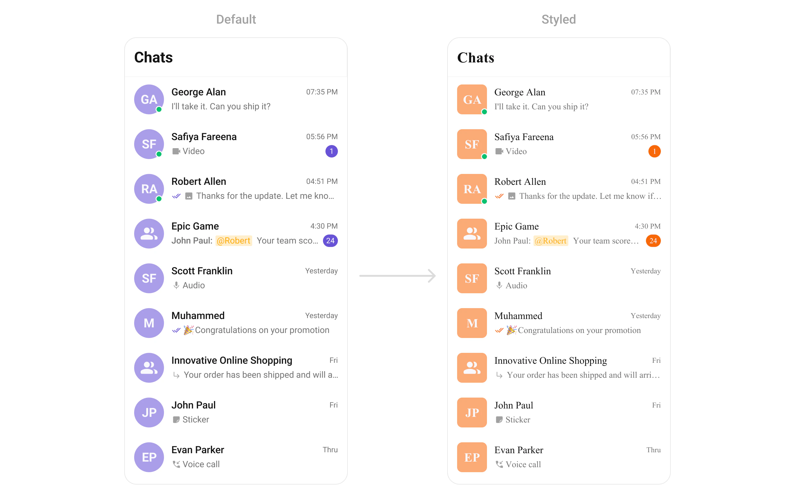 | Base components | Avatar, Badge, StatusIndicator, Receipts, Reactions, ReactionList, MediaRecorder |