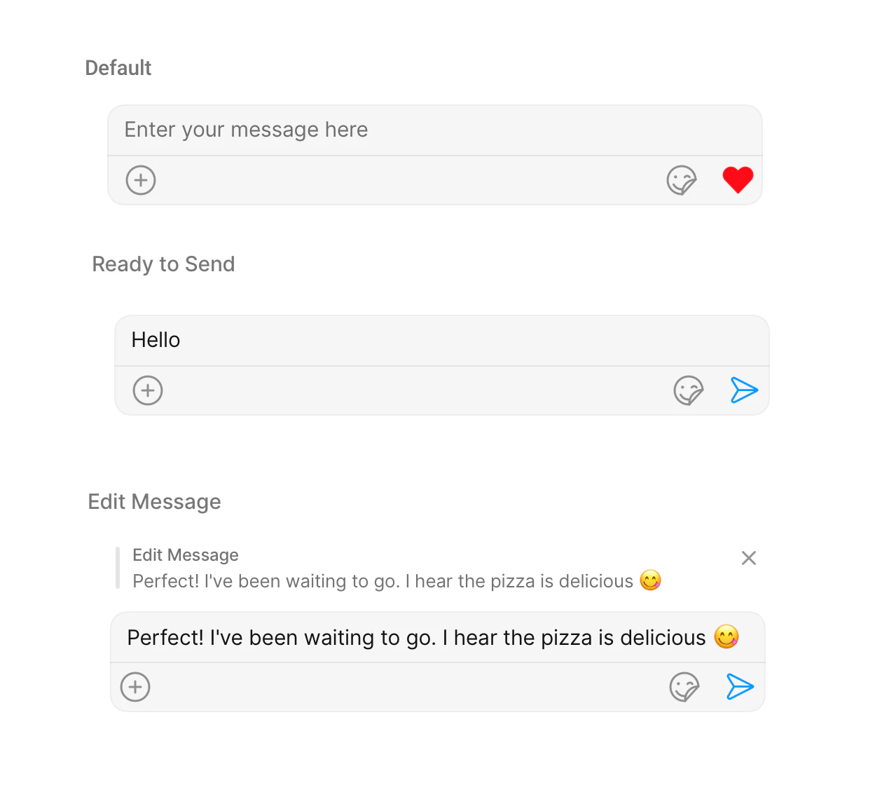 | MessageInput | This provides a basic layout for the contents of this component, such as the TextField and buttons |