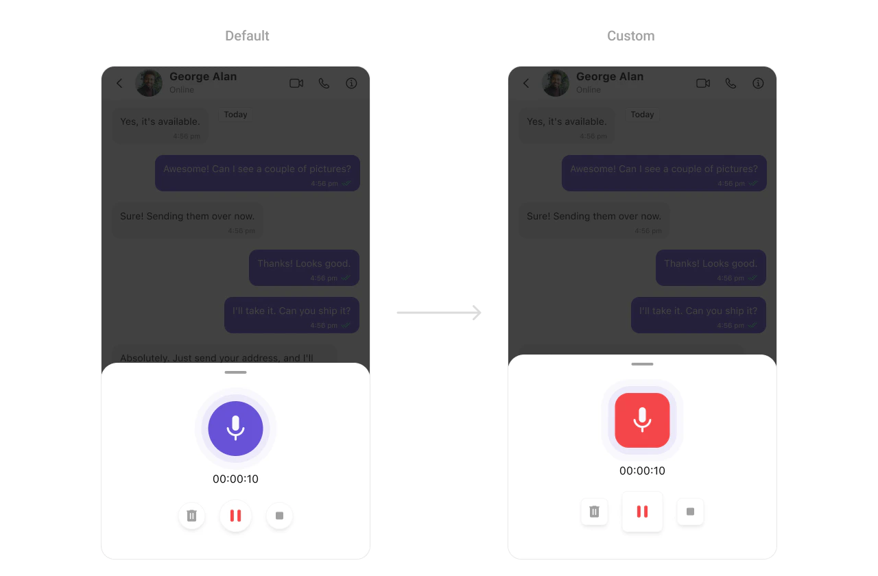 To customize the media recording styling, you can apply theMediaRecorderStyle to the MessageComposer component. For more details, please refer to MediaRecorder styles.