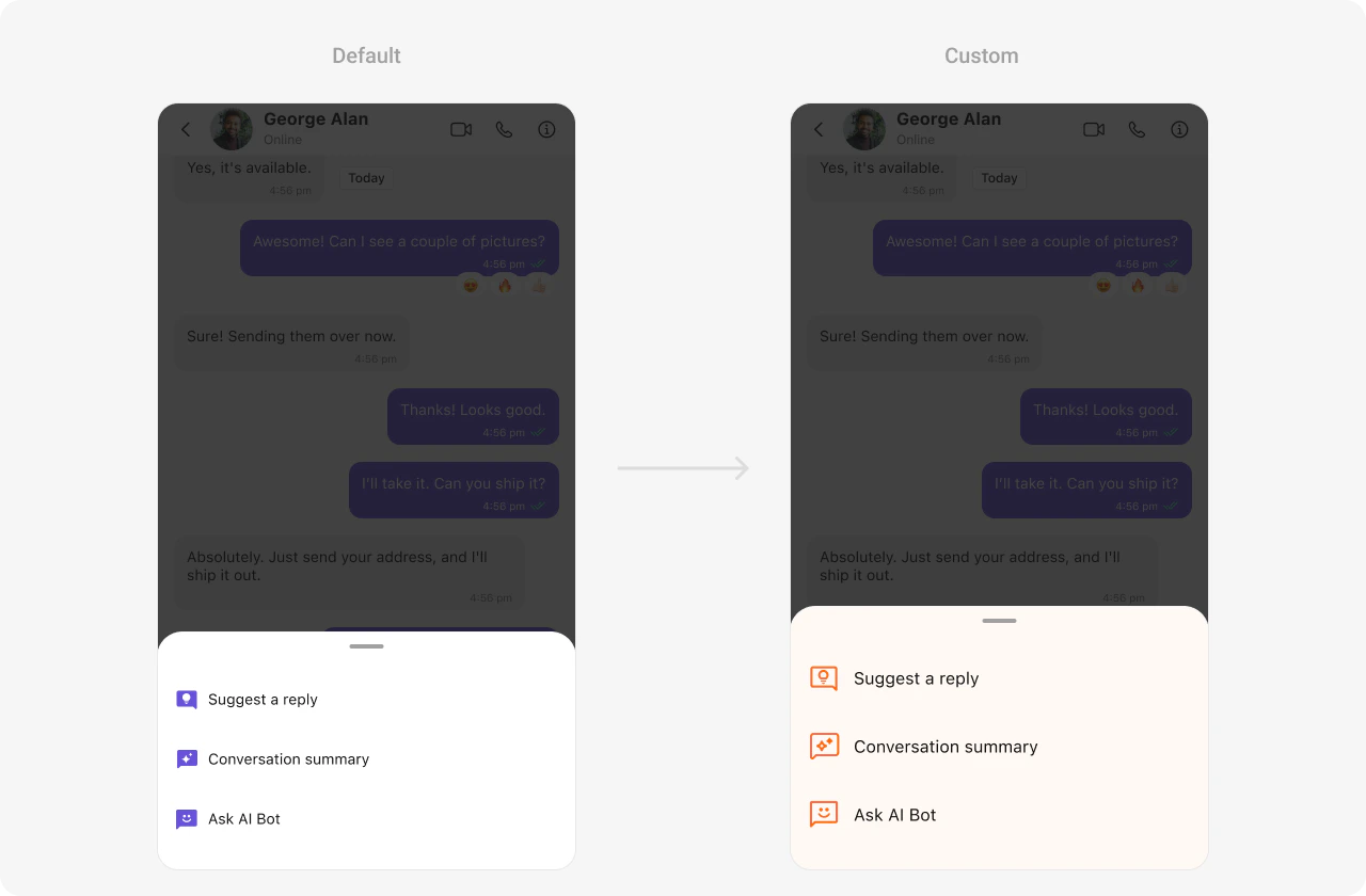 | textColor | Sets the color of the text. | aIOptionsStyle.textColor: UIColor = CometChatTheme.textColorPrimary |