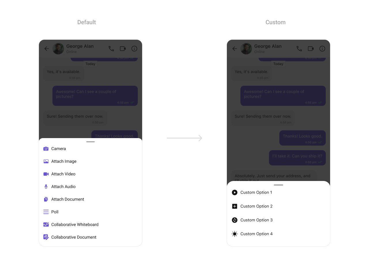 For advanced-level customization, you can set custom views to the component. This lets you tailor each aspect of the component to fit your exact needs and application aesthetics. You can create and define your views, layouts, and UI elements and then incorporate those into the component.AttachmentOptions