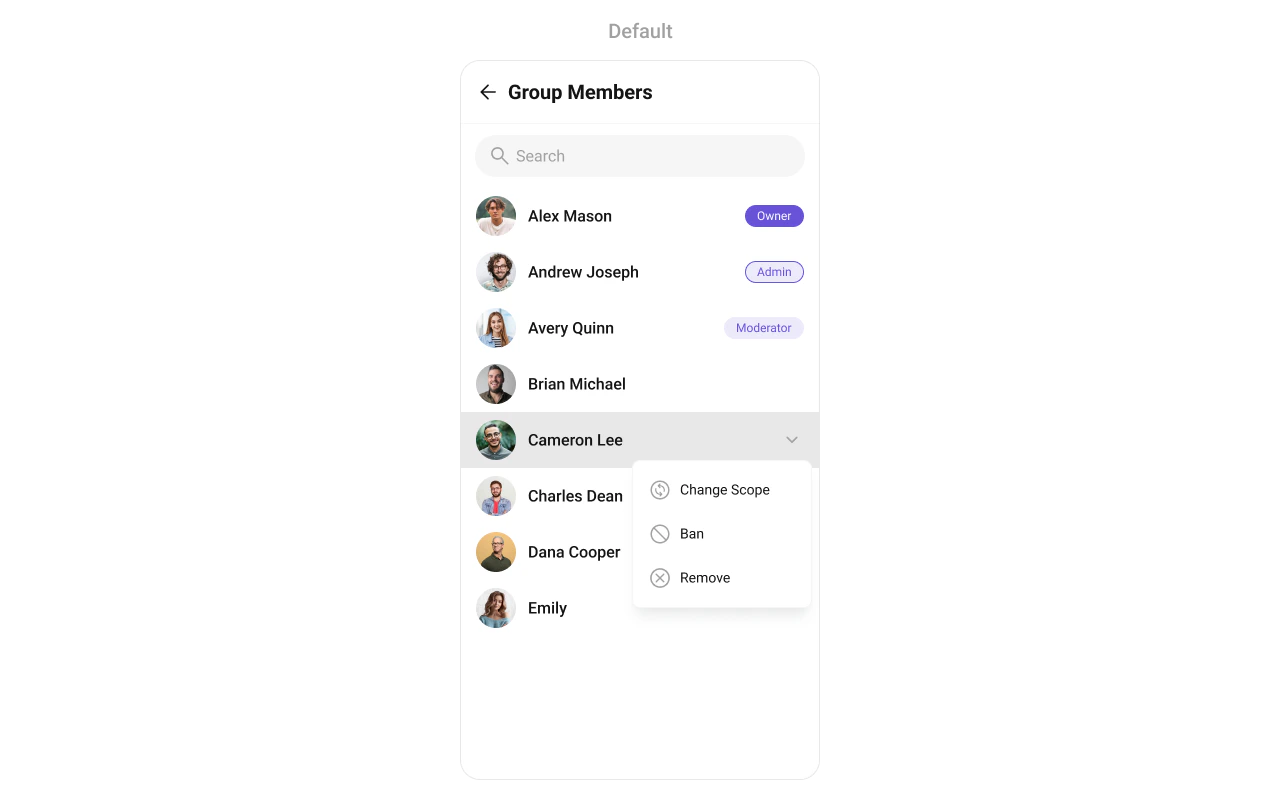"description": "Scrollable, searchable list of members in a specific group with roles, scopes, online status, and member management actions.",