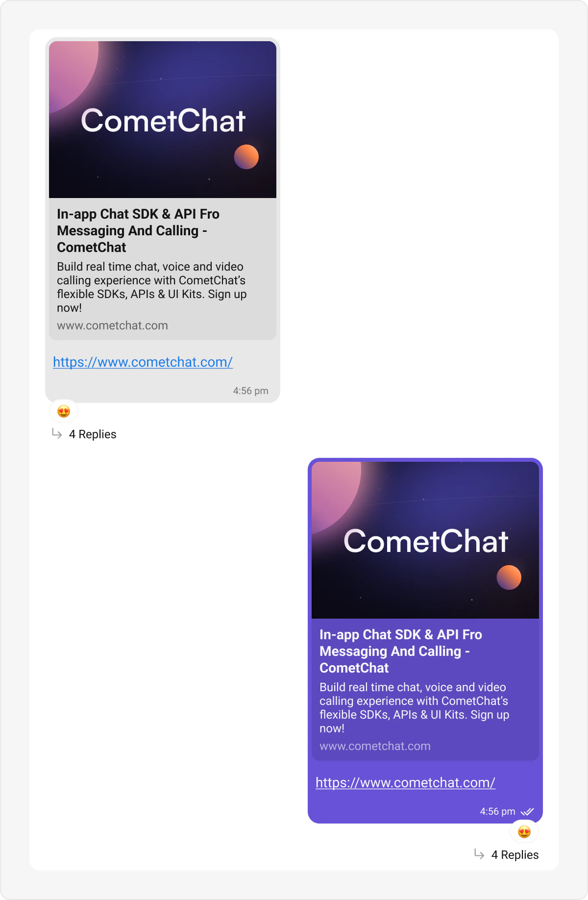 To learn more about such attributes, refer to the theme interface. The Link Preview Bubble is designed to display a preview of links shared in messages. It enriches the messaging experience by showing details such as the page title, description, and an image from the linked content, making links more engaging and informative. Default