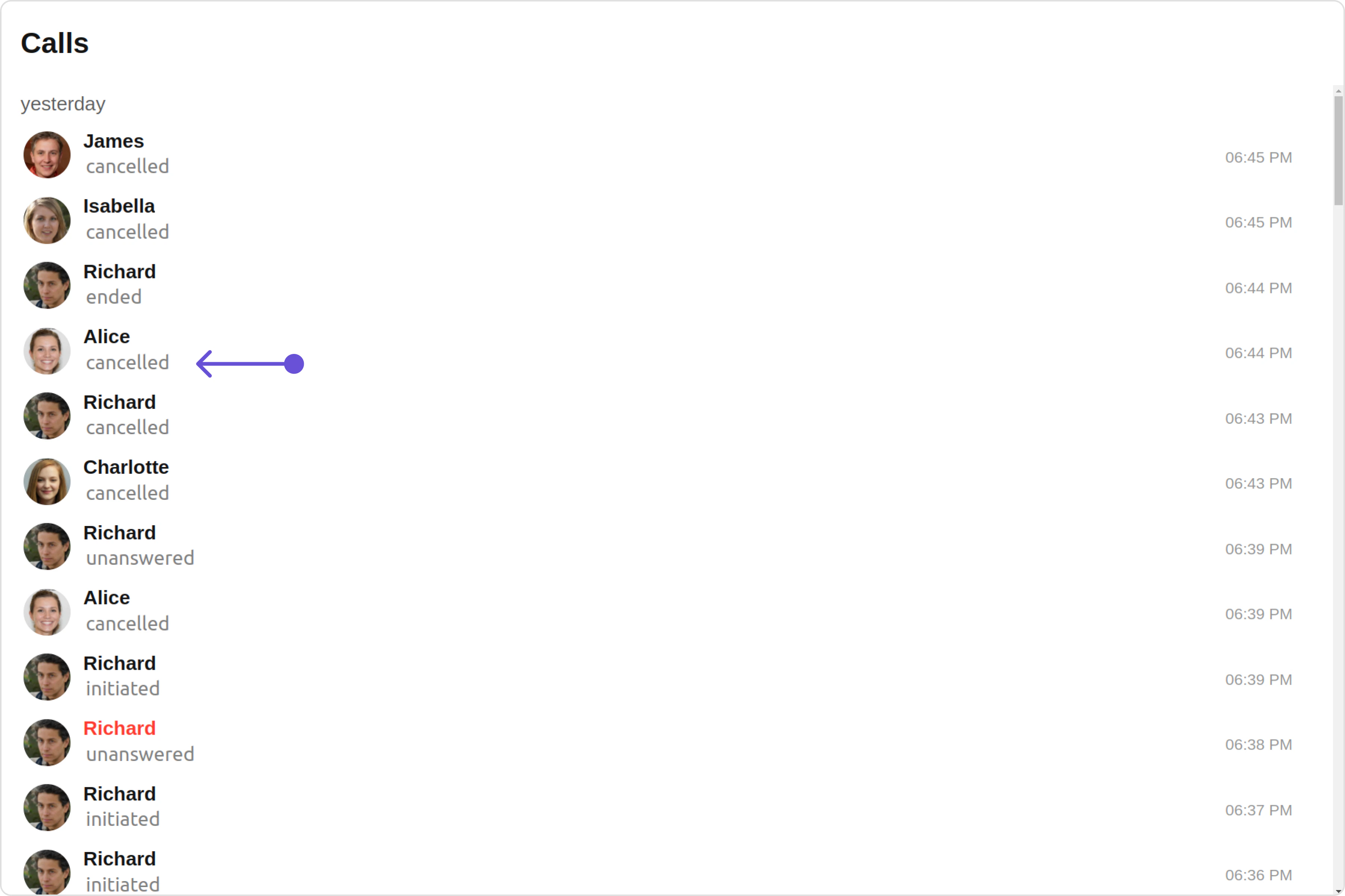 | missedVideoCallIconUrl | Used to set custom missed video call icon | missedVideoCallIconUrl='Custom Missed Video Call Icon' |