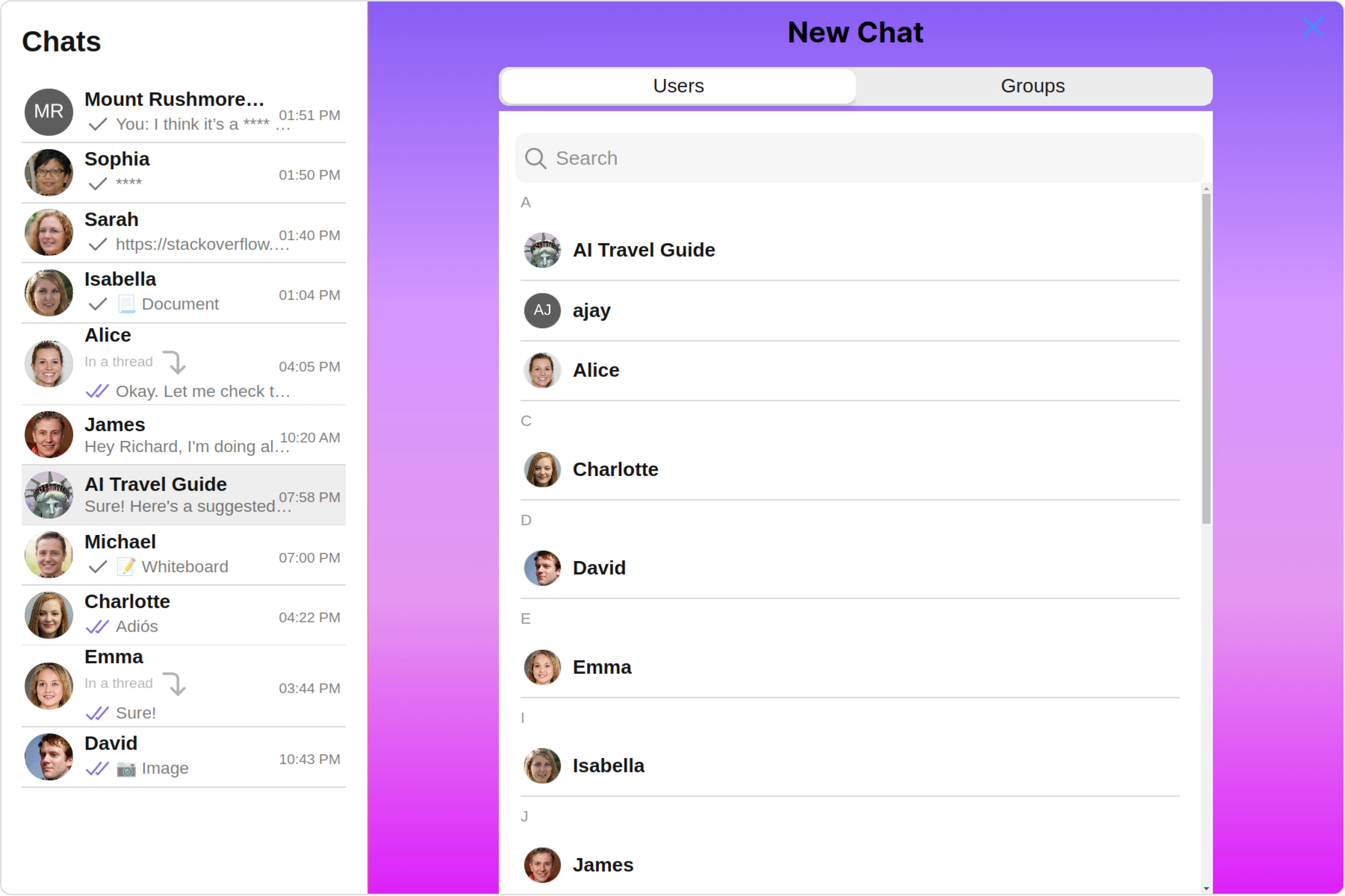 ConversationsThe Conversations component is designed to display a list of either User or Group. This essentially represents your recent conversation history.