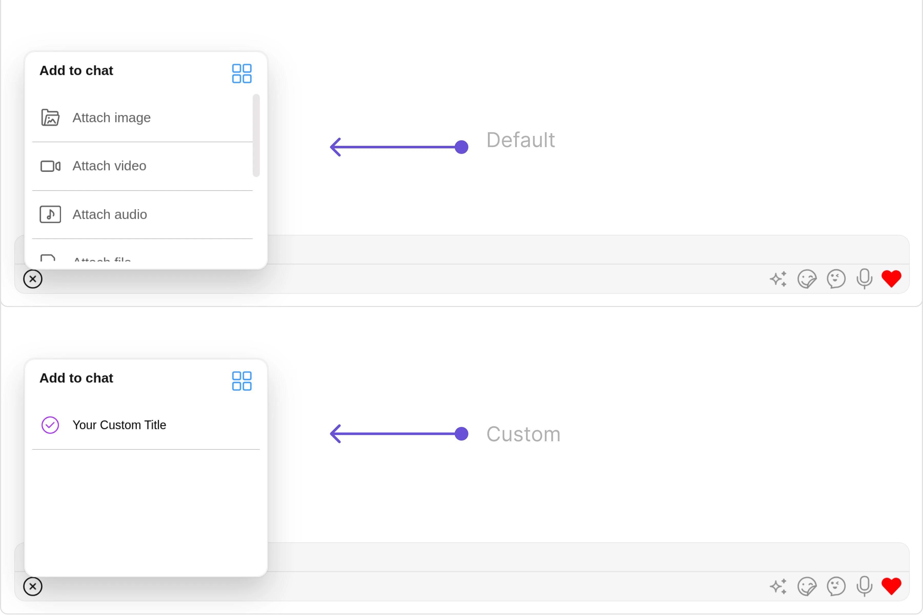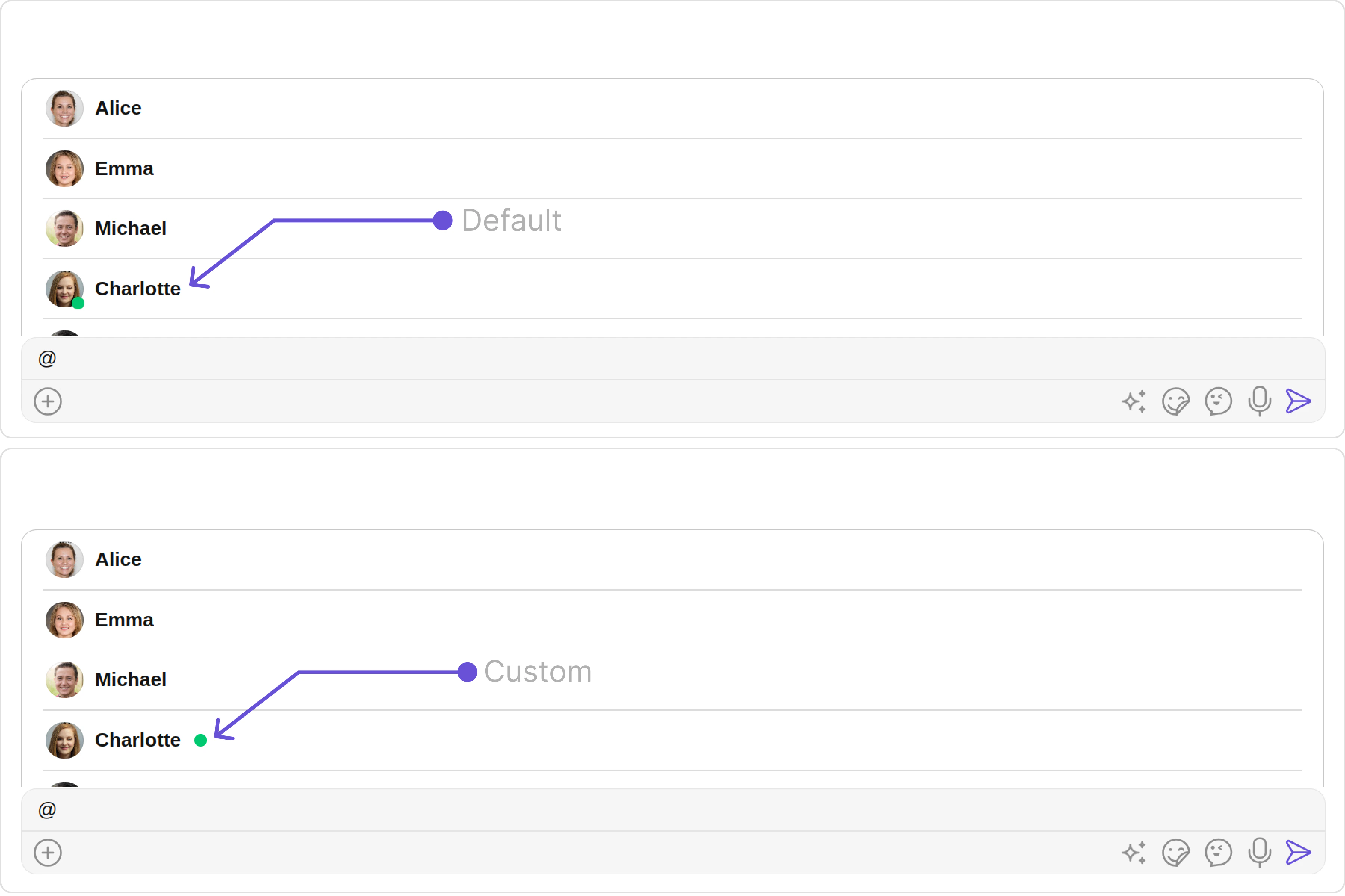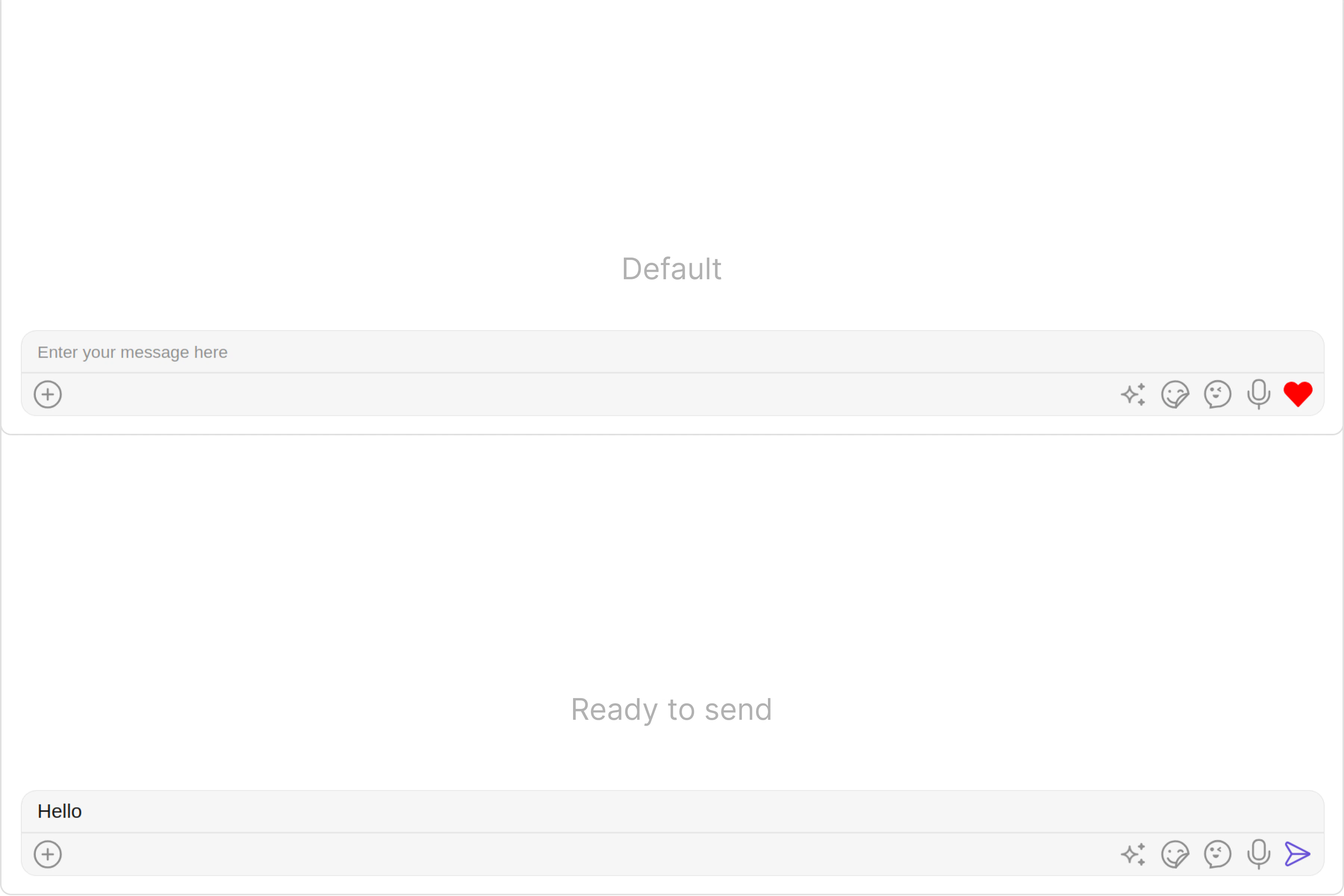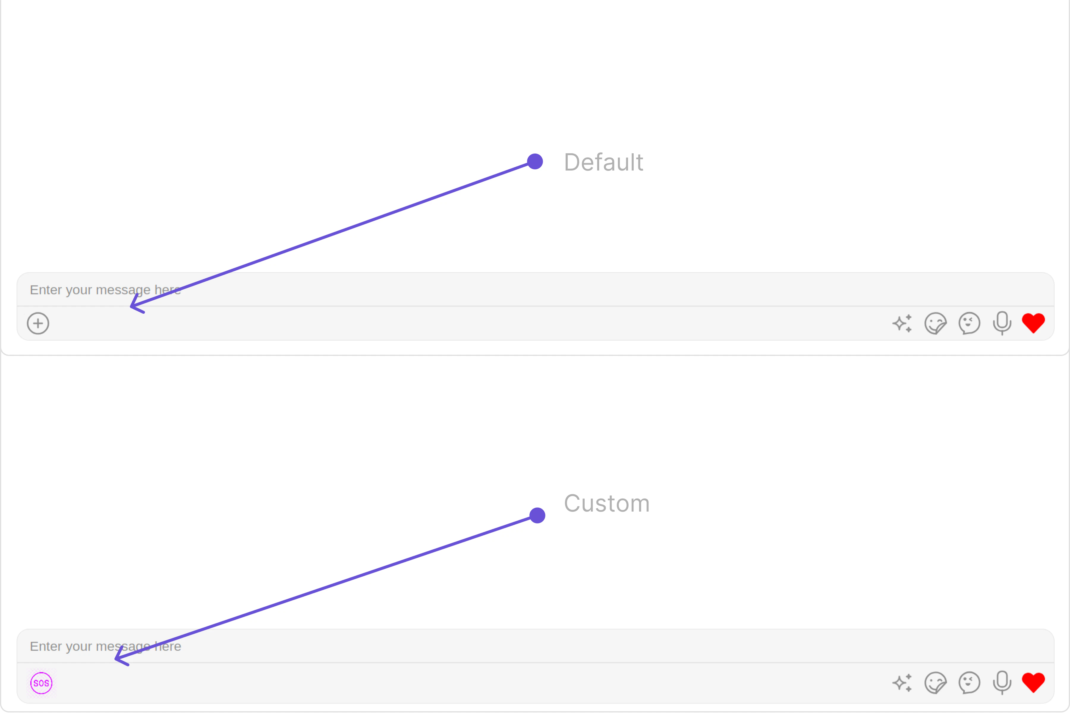 These are a set of small functional customizations that allow you to fine-tune the overall experience of the component. With these, you can change text, set custom icons, and toggle the visibility of UI elements.- MessageComposerDemo.tsx