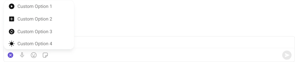 By using attachmentOptions, you can set a list of custom MessageComposerActions for the MessageComposer Component. This will override the existing list of MessageComposerActions. Shown below is the default chat interface.