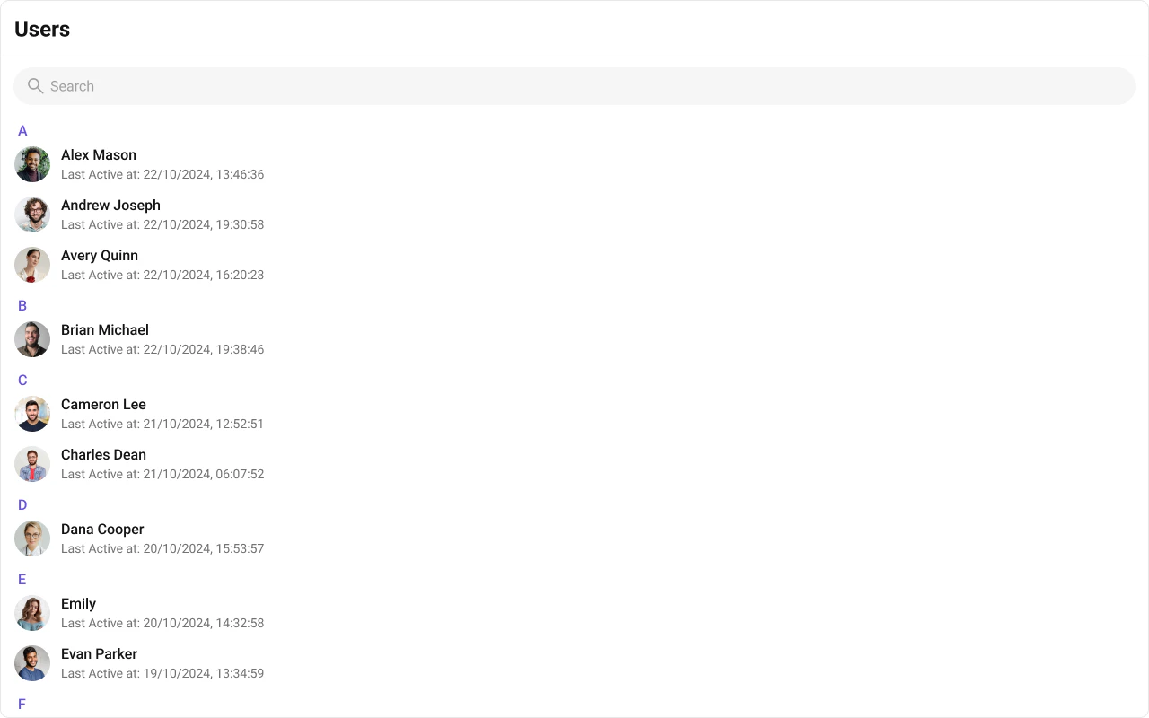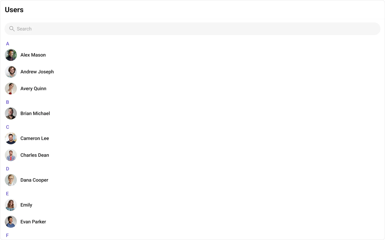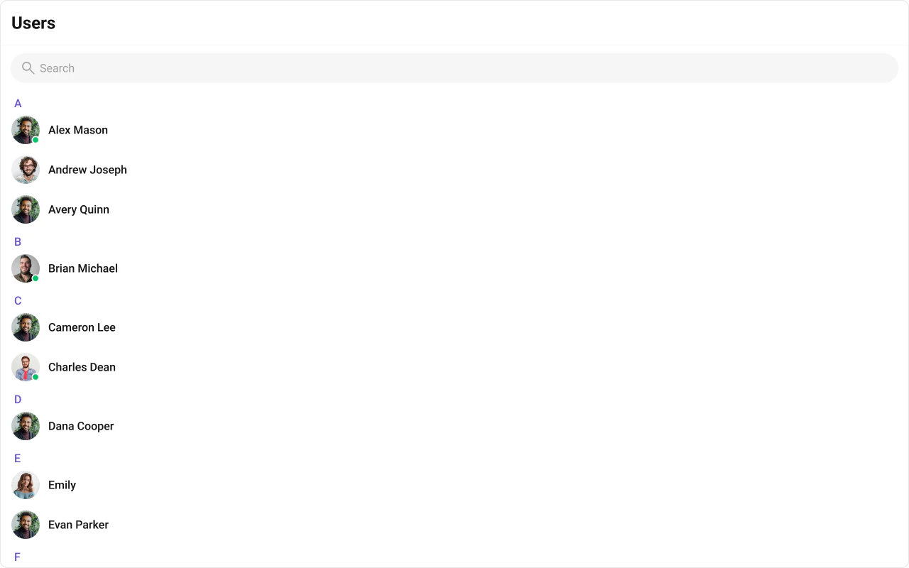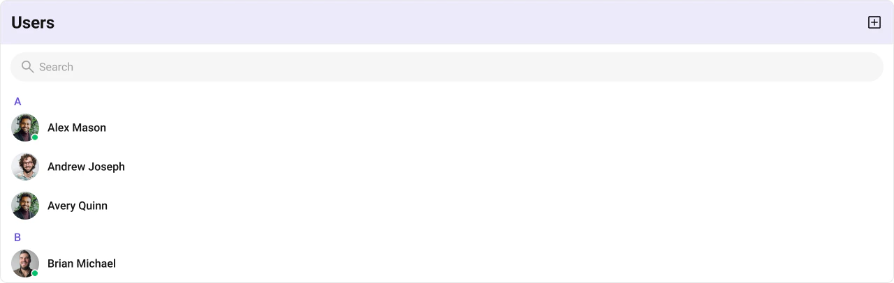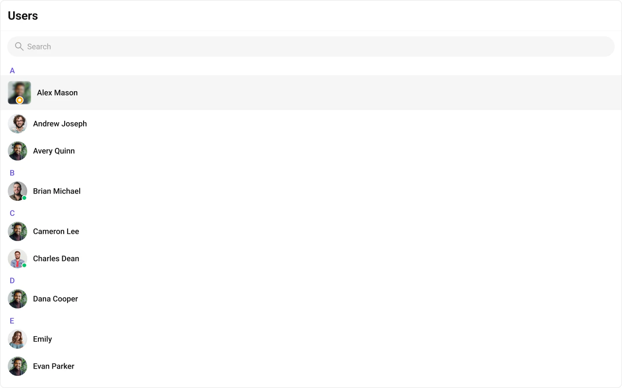 To fit your app’s design requirements, you can customize the appearance of the Users component. We provide exposed methods that allow you to modify the experience and behavior according to your specific needs.