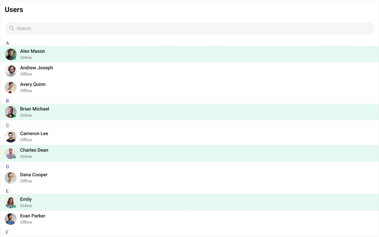 The Users is a Component, showcasing an accessible list of all available users. It provides an integral search functionality, allowing you to locate any specific user swiftly and easily. For each user listed, the widget displays the user’s name by default, in conjunction with their avatar when available. Furthermore, it includes a status indicator, visually informing you whether a user is currently online or offline.